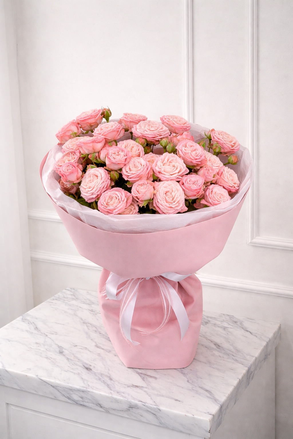 Нежный букет из кустовых роз в розовых оттенках - стильная композиция для подарка на день рождения, свидание или благодарность.