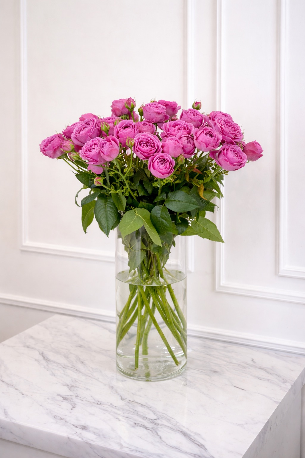 Букет оформлен в прозрачной стеклянной вазе, что делает его полностью готовым подарком без дополнительной упаковки. Свежие кустовые розы премиум качества долго сохраняют свою форму и насыщенный цвет.